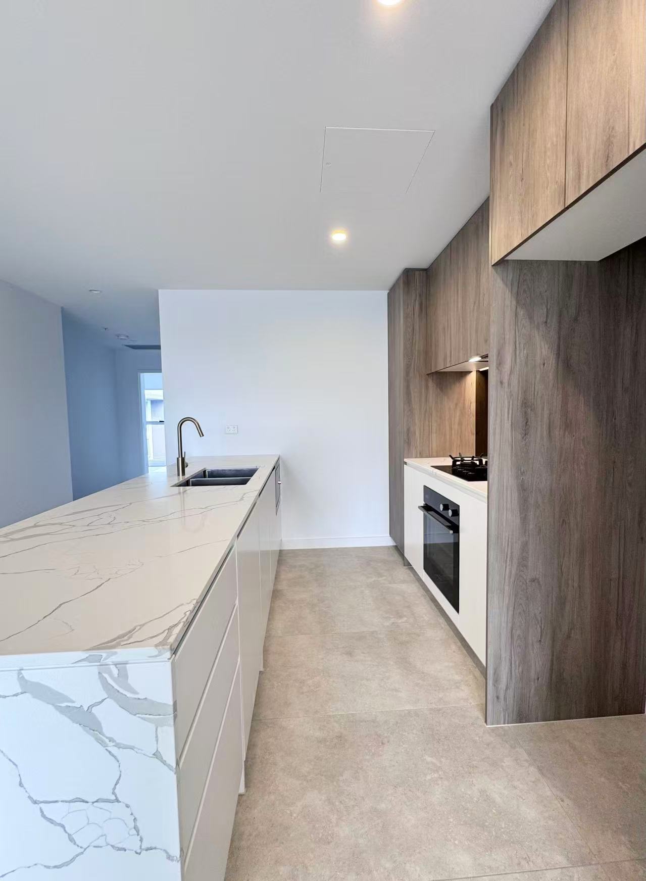 The sleek kitchen is fitted with quality appliances, ample storage, and stone benchtops, making everyday cooking easy and enjoyable.